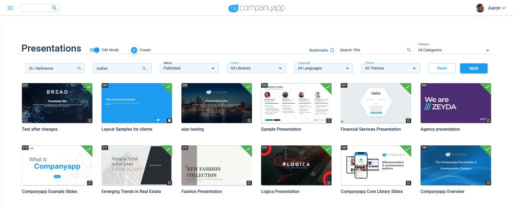 The presentation list screen, with 'Edit Mode' selected, shows you ALL the presentations that you have access to, in both Draft and Published status. Without 'Edit Mode' selected, you only see Published presentations. To go through this page in detail - please use the navigation in the left-hand side bar.
