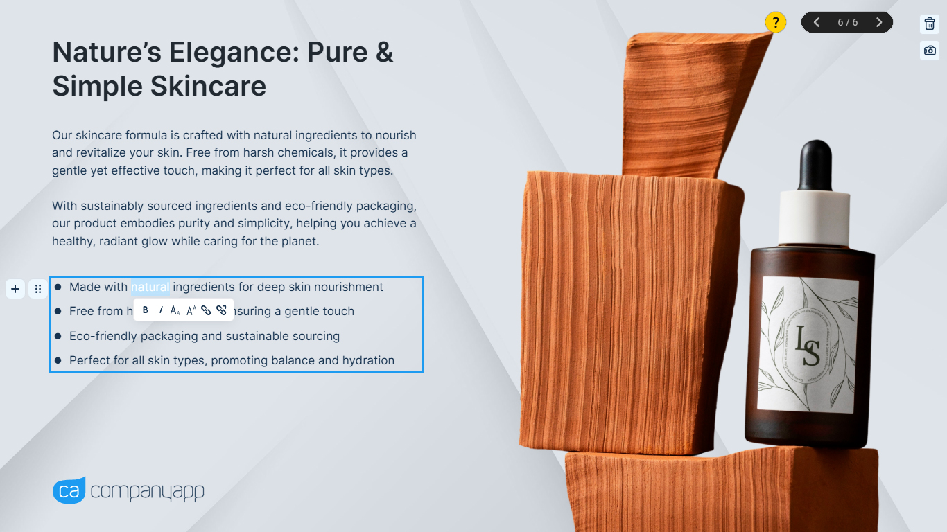 This screen is where you edit the visual content of your slides. When you create a new slide, it will have default ‘placeholder’ text & a perhaps a ‘placeholder’ image, or video. Simply click on this default content & edit it, as required.